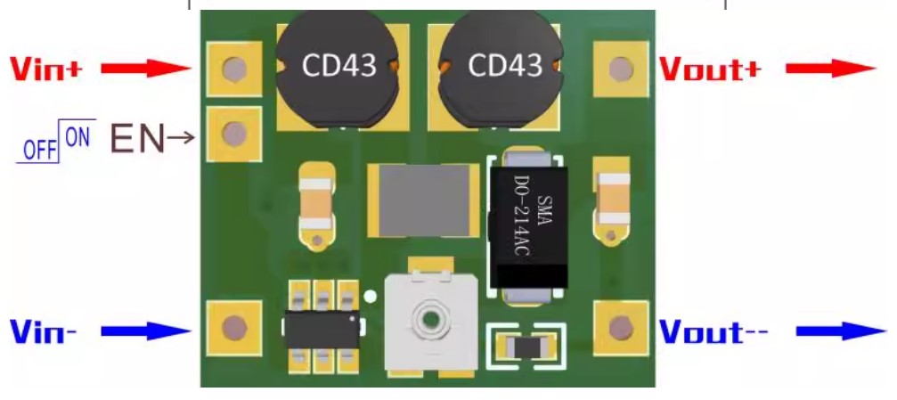 Внимание!!! Для того, чтобы на выходе появилось напряжение, контакт IN+ и EN, должны быть соединены вместе.