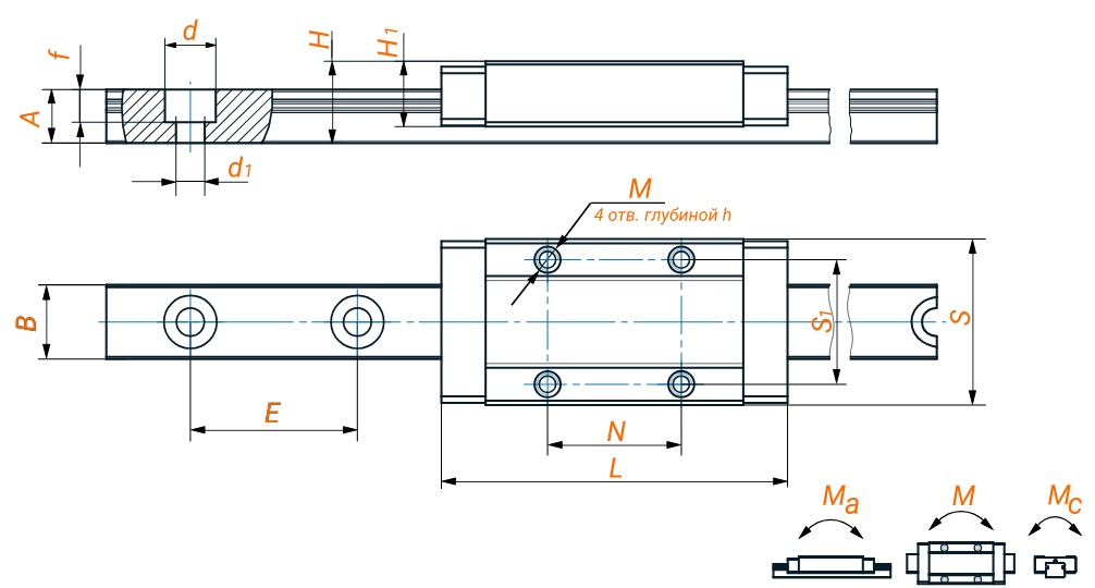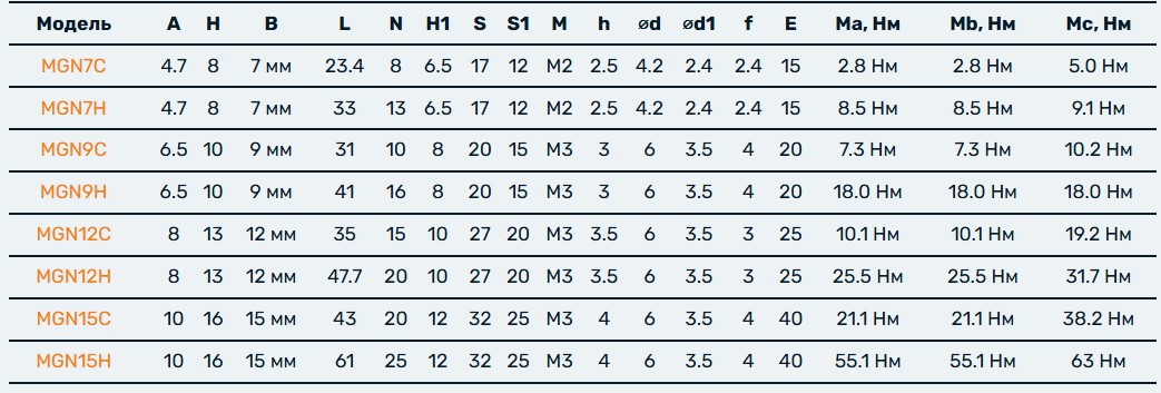 MGN15H имеет увеличенную длину, что позволяет разместить большее количество тел качения. Благодаря этому обладает повышенной грузоподъемностью и моментами сопротивления.