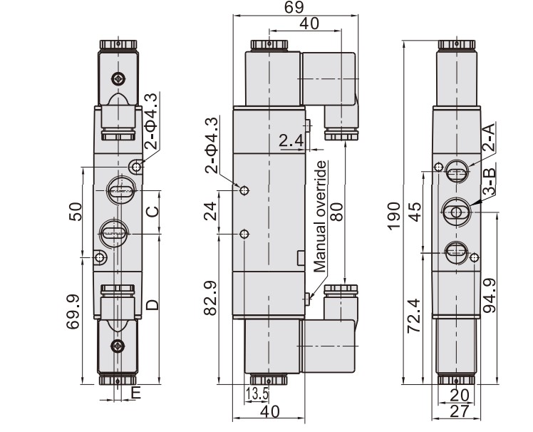 Пневматический электромагнитный клапан 4V320-10 с 2 катушками управления служит для управления направлением движения потоков сжатого воздуха. Управление осуществляется за счет переключения схемы соединения внутренних каналов распределителя с входными и выходными присоединительными отверстиями.