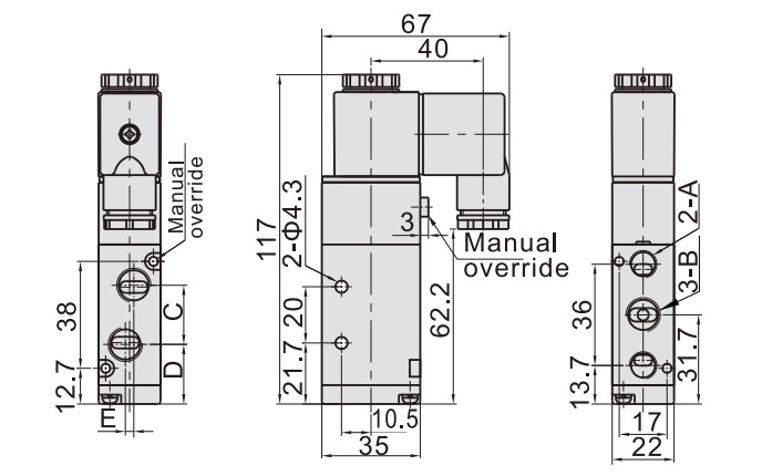 Пневматические электромагнитные клапаны 4V210-08 - пятилинейные двухпозиционными (5/2) пневматические распределители с односторонним электропневматическим управлением и пружинным возвратом золотника в исходное положение. Данные клапаны применяются в различного рода пневматических приводах и служат для управления направлением потоков рабочей среды пневмосистемы (сжатый воздух), её пуском и остановом.