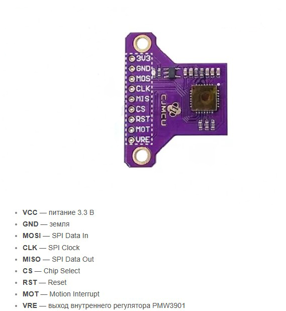 PMW3901 работает по принципу оптической мыши, но оптимизирован для работы на больших расстояниях. Датчик фиксирует последовательность изображений поверхности и вычисляет смещение между кадрами, выдавая приращения по осям X и Y. Для подсветки поверхности служат две встроенные белые светодиодные матрицы, обеспечивающие стабильную работу при различных условиях освещения .