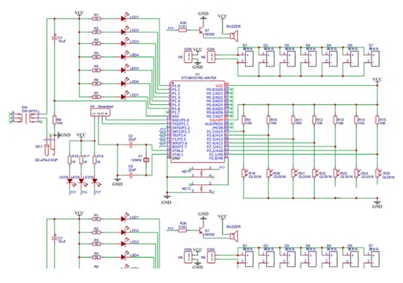 Электрическая схема состоит из двух основных частей: фоторезисторов и микроконтроллера STC89C52. Когда луч, испускаемый лазерным модулем, перекрывается, соответствующий фоторезистор реагирует на это, и его сопротивление изменяется. Система из восьми фоторезисторов генерирует изменения высокого и низкого уровней напряжения, которые считываются микроконтроллером, завершая таким образом ввод пользовательской команды.